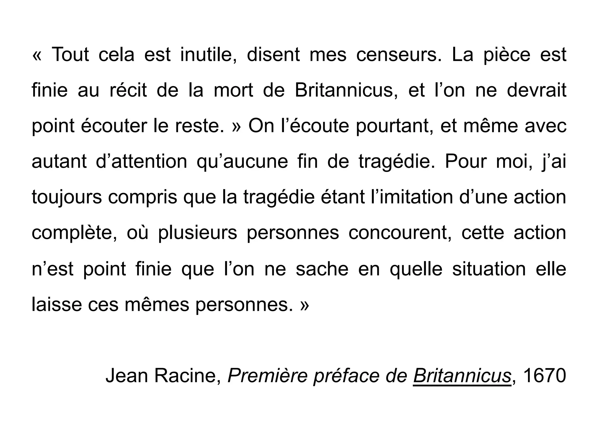 Jean Racine, dans sa première préface de Britannicus, souligne que la tragédie ne peut être considérée comme complète sans connaître le sort final des personnages. Malgré les critiques qui jugent la pièce inachevée après la mort de Britannicus, il affirme que l'écoute du reste est importante. Ainsi, il défend l'importance de comprendre l'issue de l'action pour une compréhension totale de la tragédie.