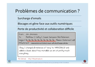 Le document présente le produit Prefercom d'ynternet.com, qui propose des formations pour améliorer la communication et la collaboration en ligne, visant à réduire le stress lié à la surcharge d'emails et à l'inefficacité numérique. Environ 19 milliards d'euros sont perdus annuellement en raison de l'incompétence numérique aux Pays-Bas, et des formations modulaires sont offertes pour répondre aux besoins courants des employés. Le projet prévoit un modèle économique freemium et des étapes de développement s'étalant jusqu'à 2014, avec un objectif de rentabilité d'un an après le lancement.