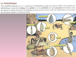 La préhistoire, débutant il y a 4 à 5 millions d'années et se terminant vers 3500 av. J.-C., évoque l'évolution humaine des premiers ancêtres jusqu'à l'homo sapiens sapiens, mettant en avant les changements physiques et culturels comme la bipédie et la fabrication d'outils. Les sociétés préhistoriques étaient nomades et vivaient en petits groupes, avec des rôles définis au sein de la communauté, avant de passer à des modes de vie sédentaires durant le néolithique, marqués par l'agriculture et l'élevage. Les découvertes de mégalithes et d'autres progrès montrent que la période néolithique a été cruciale dans le développement des premières civilisations humaines.