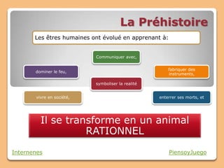 Le document décrit l'évolution humaine depuis la préhistoire jusqu'à l'apparition de l'homme moderne, en mettant en avant différentes espèces d'hominidés et leurs innovations. Il aborde l'utilisation d'outils, la maîtrise du feu, l'art, et l'agriculture, ainsi que les comportements sociaux et les rituels funéraires. Enfin, il mentionne les professions liées à l'étude de cette période, comme la paléontologie et l'archéologie.