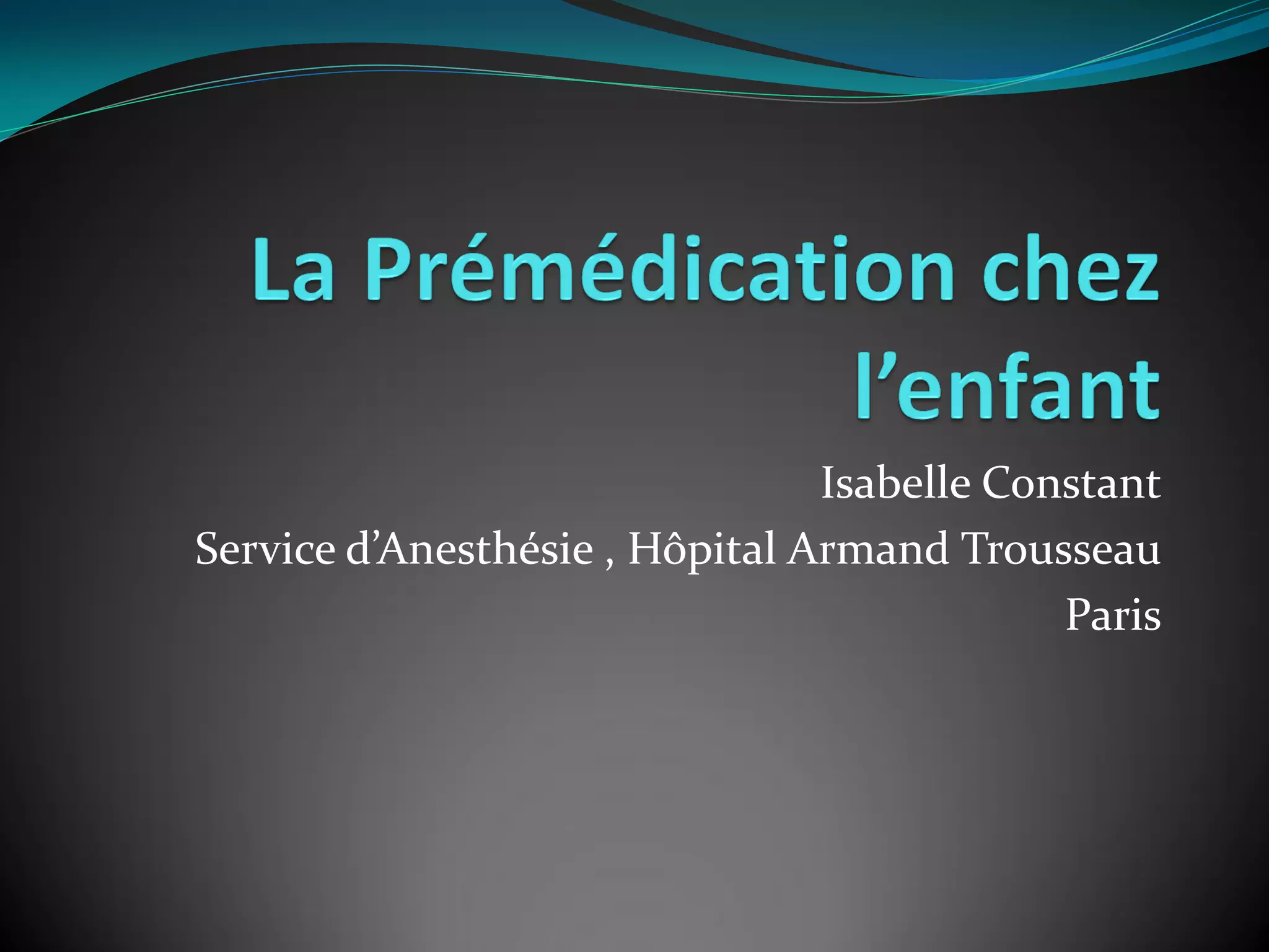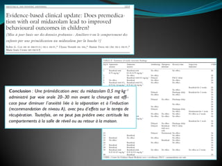 L'anxiété préopératoire chez les enfants est fréquente et peut entraîner des comportements indésirables post-opératoires, rendant la prémédication nécessaire. Des médicaments comme le midazolam et la clonidine sont souvent utilisés pour réduire l'anxiété et améliorer l'état postopératoire. L'approche relationnelle et ludique avec les patients jeunes et leurs parents est cruciale pour atténuer l'anxiété préopératoire, accompagnée de méthodes médicamenteuses.