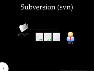 Le document présente une introduction à Subversion (SVN), un système de gestion de version. Il décrit les processus de synchronisation des projets, les commandes pour le fonctionnement avec SVN, et donne des conseils d'installation. Le contenu est structuré autour des versions de projets et des commandes utilisées pour gérer le développement.