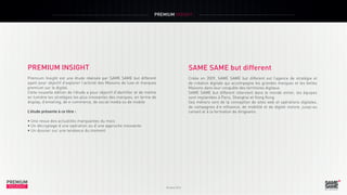 Le document présente l'étude 'Premium Insight' d'octobre 2013, menée par l'agence Same Same But Different, qui explore les stratégies digitales des marques de luxe. Il inclut des décryptages d'opérations innovantes de plusieurs marques, telles que Karl Lagerfeld, L'Oréal, Harrods et Burberry, mettant en avant leurs pratiques de personnalisation et d'interaction avec les consommateurs en ligne. L'étude illustre également l'importance croissante des outils digitaux dans le secteur de la mode et du luxe.