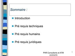 Le document traite des pré-requis techniques, humains et juridiques nécessaires à la mise en place d'un ERP. Il souligne l'importance de la direction, de la cohésion des équipes et d'un contrat clair pour éviter les dérapages dans les projets ERP. Plusieurs phases de mise en œuvre et d'intégration sont détaillées, accompagnées d'exemples et de recommandations spécifiques.