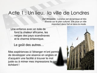 Le document présente un parcours artistique et professionnel à travers des éléments de la culture londonienne et de l'art contemporain, symbolisés par la Tate Gallery. Il décrit également l'importance de la musique, de la logistique et d'une agence de communication efficace dans la réussite d'un événement. L'intervenant se propose pour un poste de directrice de clientèle événementiel, mettant en avant son expérience et son dynamisme.