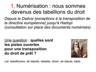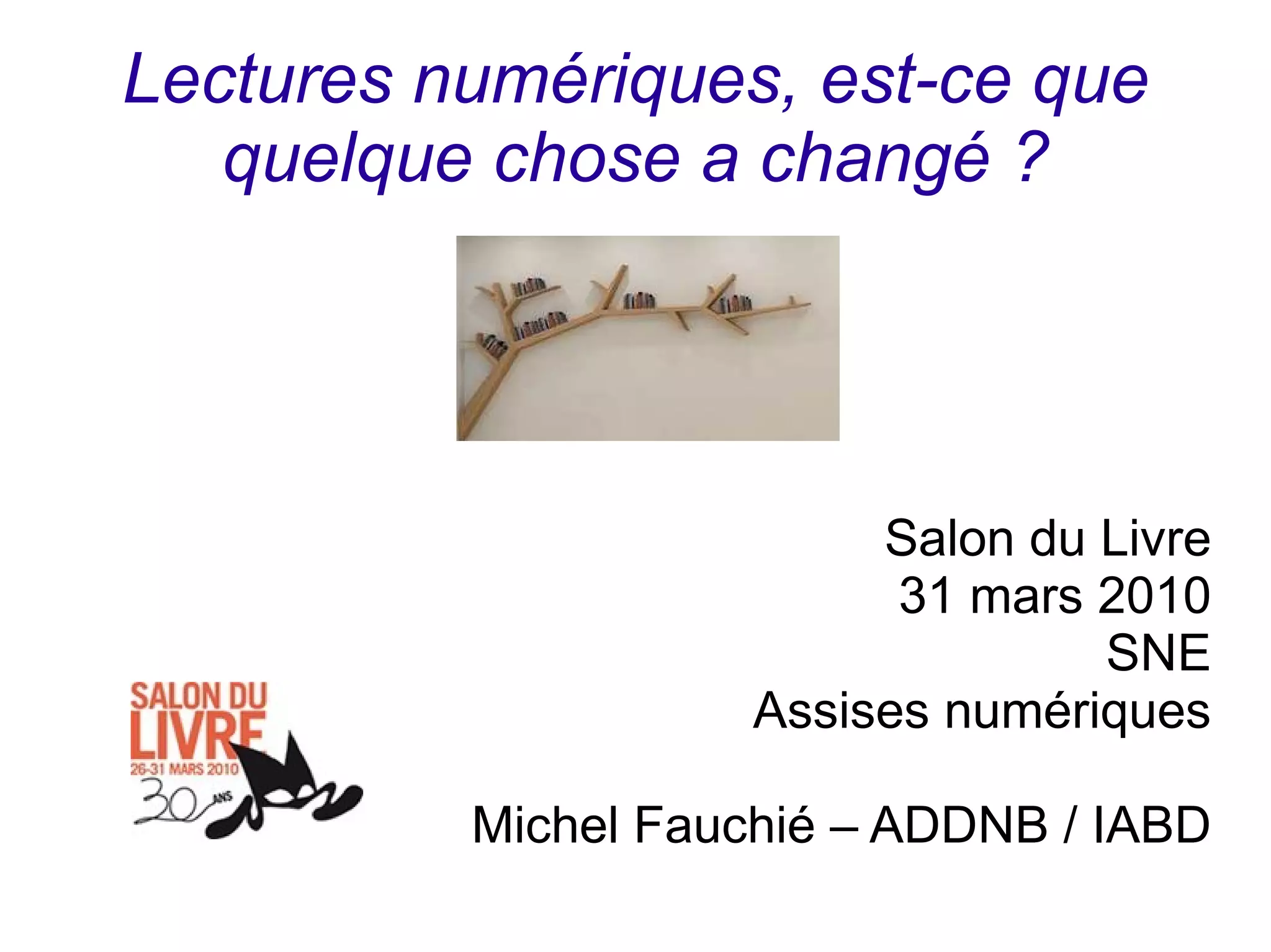 Le document discute de l'évolution des bibliothèques face à la numérisation et aux livres numériques, en soulevant des questions sur la transposition des droits de prêt et le modèle économique du livre numérique. Il met en lumière l'importance de la médiation numérique et des nouveaux services pour faciliter l'accès à la lecture. Enfin, il questionne le rôle des bibliothèques dans le paysage du livre numérique et appelle à une transparence dans la distribution et les partenariats.