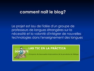 Le document présente un projet d'innovation sur l'intégration des technologies de l'information et de la communication (TIC) dans l'enseignement des langues, initié par un groupe de professeurs de six lycées de la province de Malaga en 2008. Il décrit les activités et les entrées publiées sur un blog, incluant des concours et des événements autour de la tolérance et de l'interculturalité. Le projet vise à favoriser la collaboration entre établissements et la créativité des élèves à travers diverses initiatives.