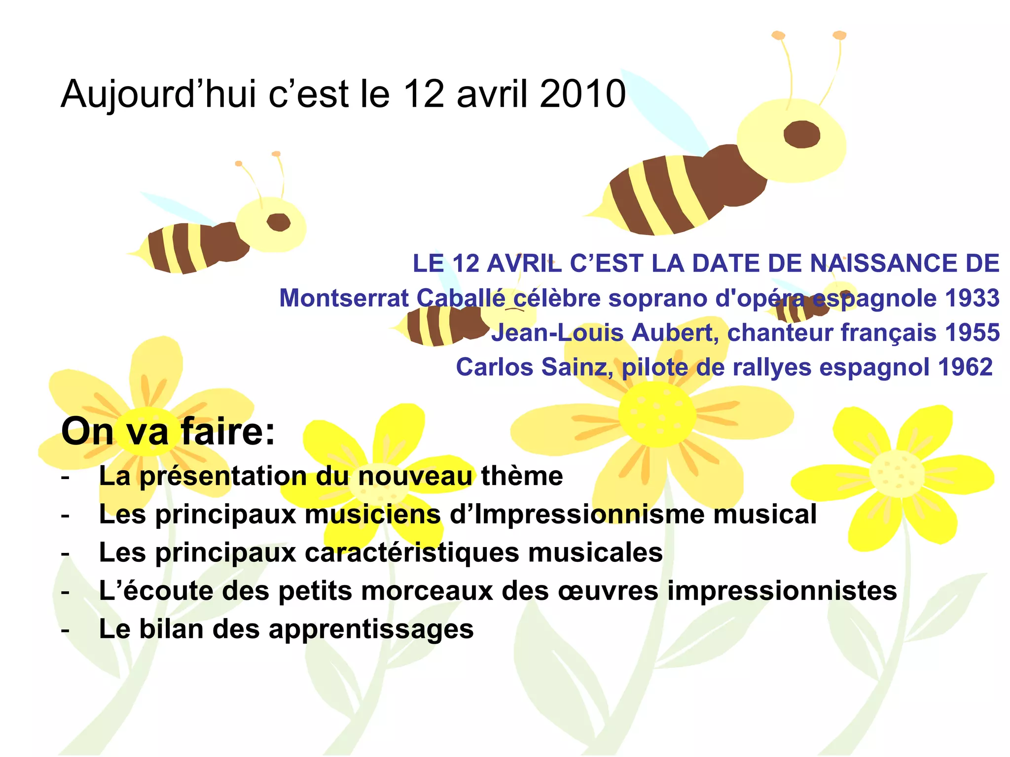 Le document présente une séance sur l'impressionnisme musical, incluant des musiciens comme Debussy et Ravel, ainsi que les caractéristiques de leur musique. Il aborde l'écoute d'œuvres impressionnistes et les réflexions des élèves sur des extraits musicaux. La séance se termine par un bilan des apprentissages et la préparation d'une affiche sur 'Clair de Lune' de Debussy.