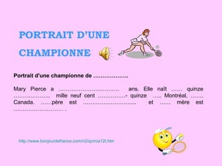 Le document demande aux lecteurs d'écouter un fichier et de compléter un texte sur la championne de tennis Mary Pierce. Il fournit des informations clés sur son âge, sa date de naissance, et la nationalité de ses parents. Les lecteurs sont ensuite invités à répondre à des questions sur le texte pour renforcer leur compréhension.