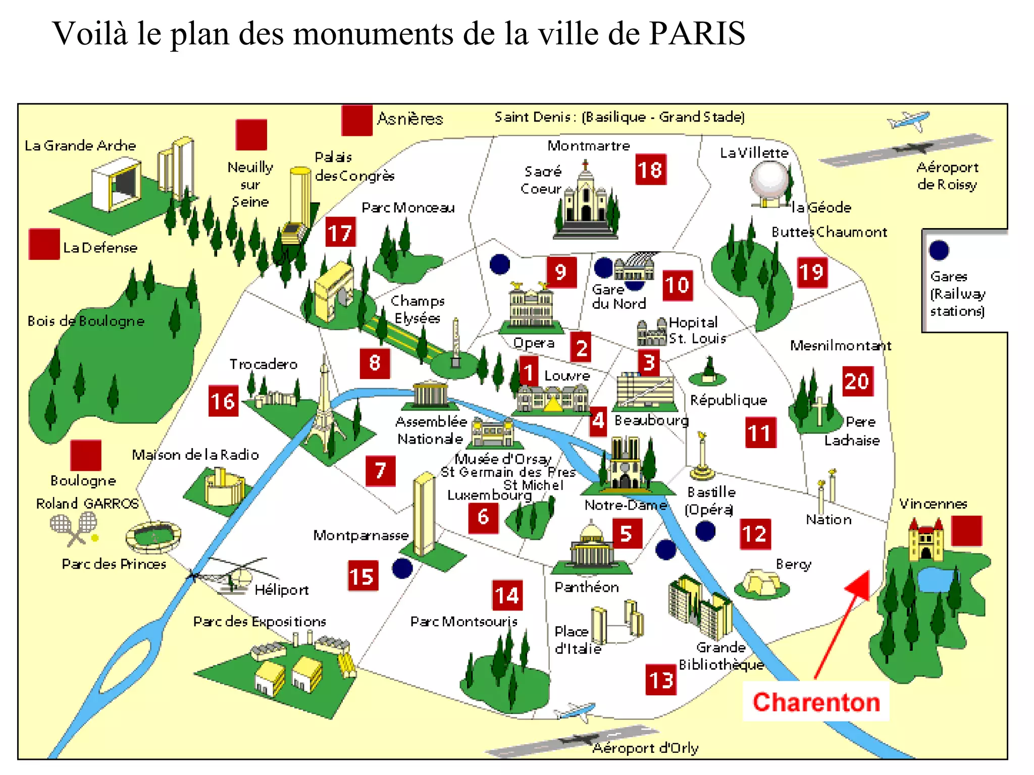Le document présente un plan des monuments emblématiques de la ville de Paris, incluant des sites célèbres tels que Notre-Dame, le Pont Neuf et la place des Vosges. Il mentionne également des attractions nocturnes, comme la façade de Notre-Dame et la grande arche de la Défense. Ce document sert de guide pour découvrir l'architecture et la culture parisienne.