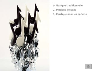 Le document aborde divers thèmes liés à la musique, tels que la musique traditionnelle et actuelle, ainsi que des catégories comme la civilisation, les personnes et les objets. Il mentionne également des éléments de la grammaire, y compris les temps verbaux, les prépositions et les articles. En somme, il présente une structure d'apprentissage diversifiée.