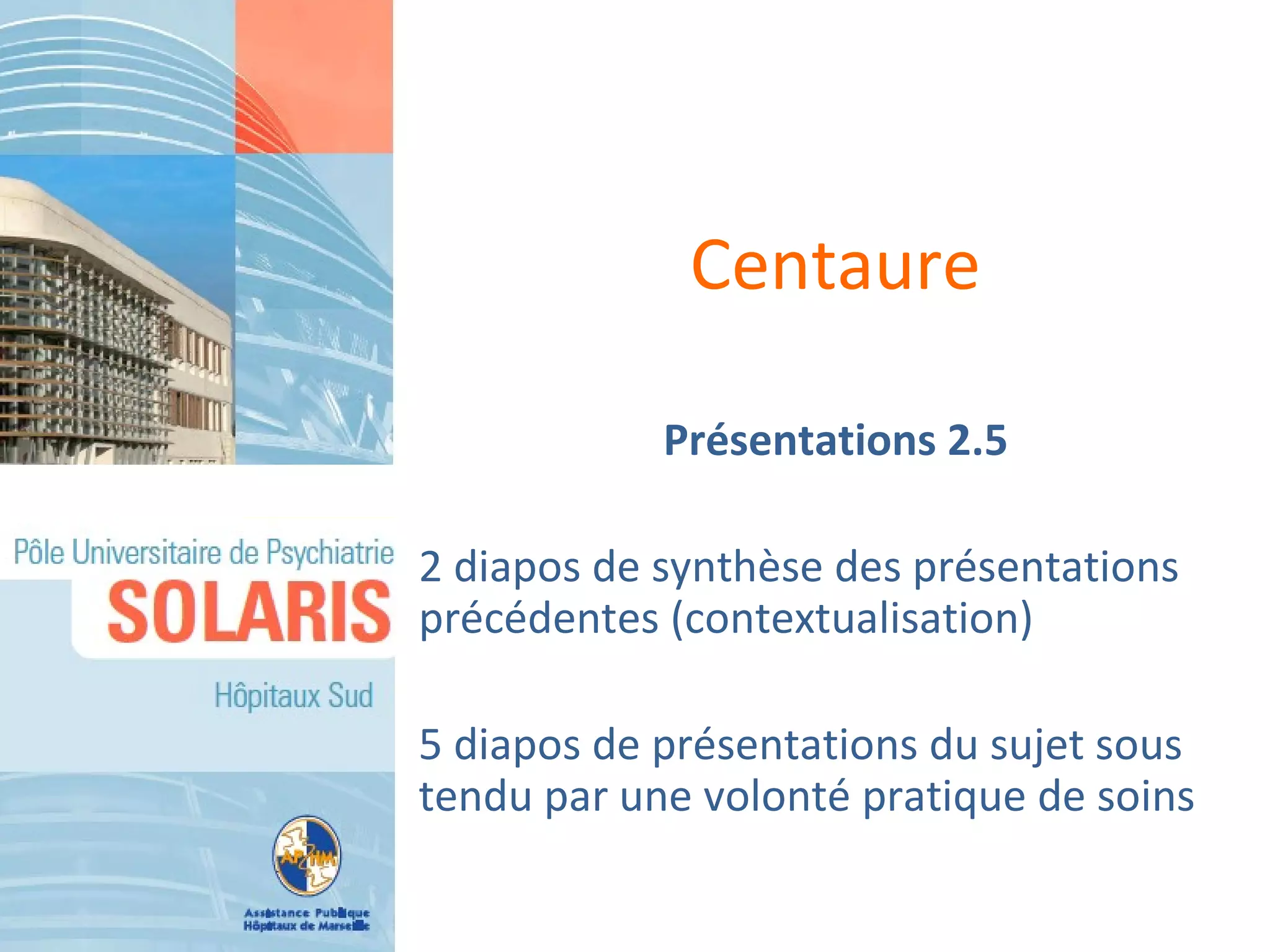 Le document présente des concepts et modèles pour la prise en charge du handicap en psychiatrie, en mettant l'accent sur la réhabilitation et la psychoéducation. Il aborde des axes tels que les troubles psychiatriques, les facteurs psychosociaux, et les stratégies de prévention de la rechute. De plus, il souligne l'importance d'individualiser les soins et d'impliquer les patients dans leur processus de réhabilitation.