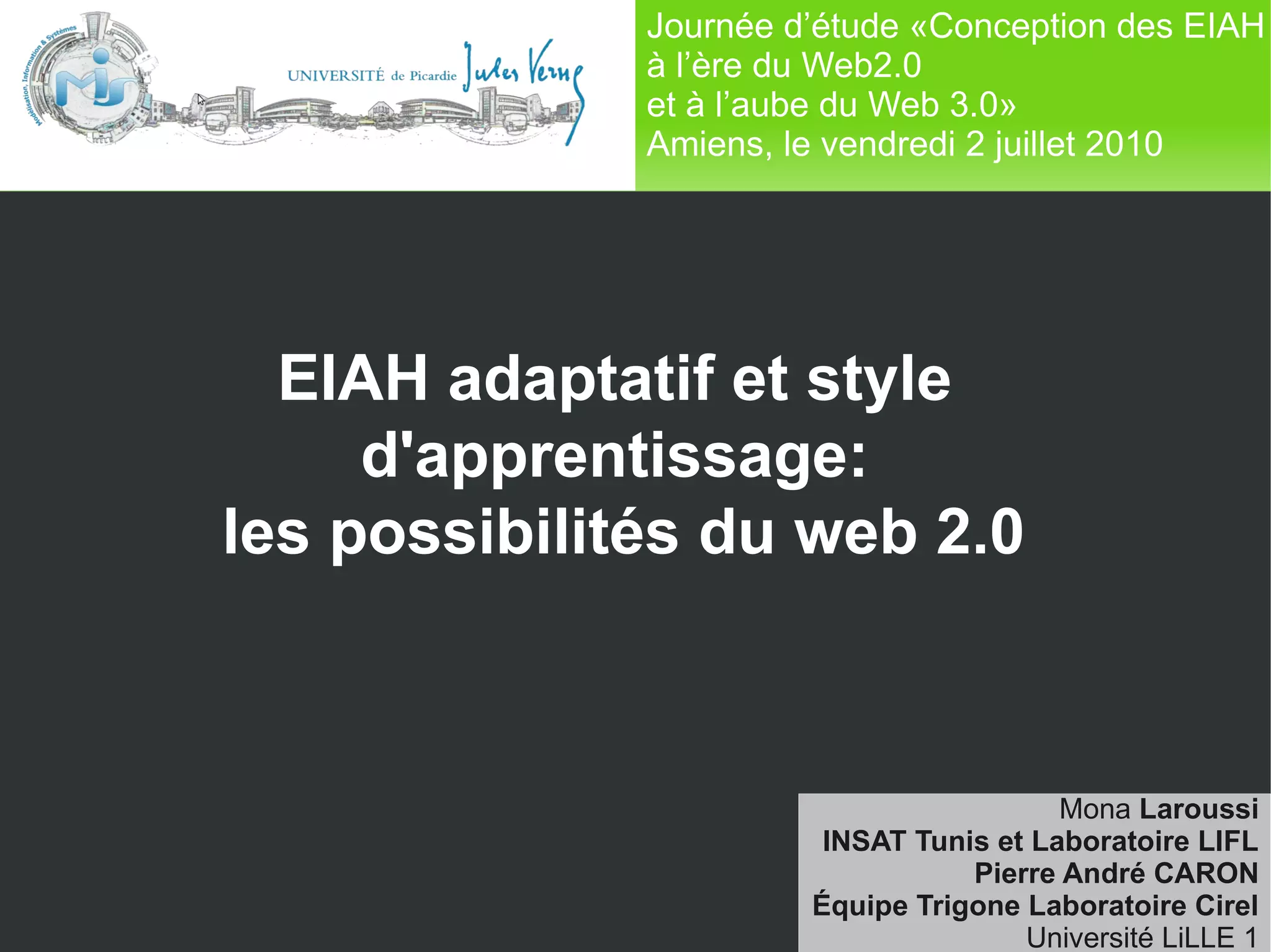 Ce document traite de la conception des EIAH (Environnements Informatiques pour l'Apprentissage Humain) à l'ère du Web 2.0 et du Web 3.0, en mettant l'accent sur l'adaptation des plateformes d'apprentissage aux styles d'apprentissage des étudiants. Il propose un framework intégrant des services Web 2.0 pour améliorer la collaboration et l'apprentissage, avec des scénarios expérimentés sur Moodle. Les résultats préliminaires indiquent une réduction du temps consacré par les étudiants aux exercices en groupe, tout en soulignant la nécessité de valider l'adaptabilité du système.