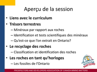 L'atelier de formation proposé par l'Association des prospecteurs et développeurs du Canada aborde des concepts liés aux sciences de la terre, tels que l'identification des minéraux, le recyclage des roches et l'importance des fossiles en Ontario. Les participants sont guidés à travers des activités pratiques pour mieux comprendre les différents types de roches et leur histoire géologique. Des ressources sont également fournies pour soutenir les enseignants dans l'intégration de ces concepts dans le curriculum scolaire.