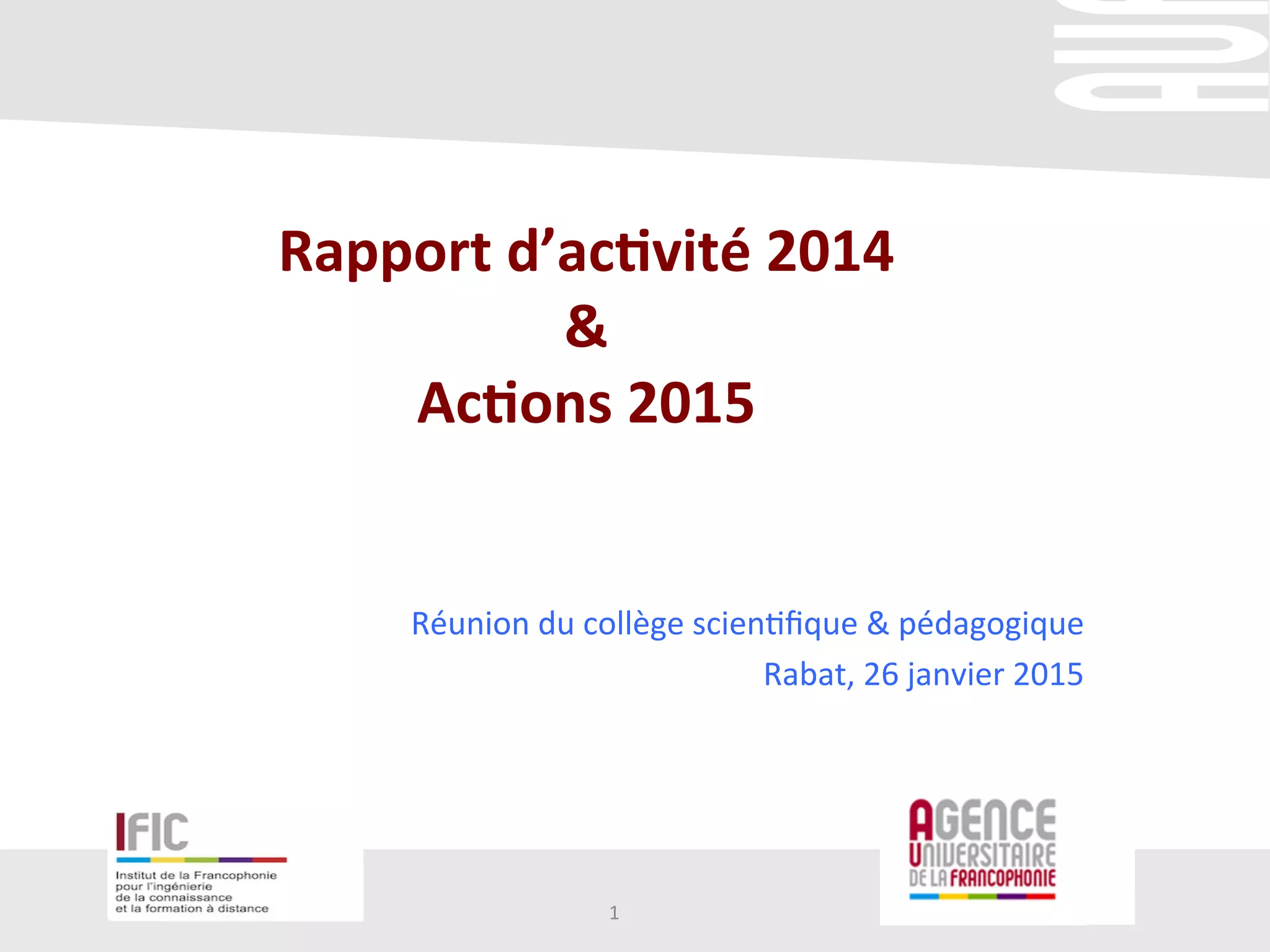Le rapport présente les activités de l'IFIC en 2014 et les projets pour 2015, axés sur le soutien aux établissements d'enseignement supérieur pour relever les défis éducatifs modernes. Il souligne les initiatives en matière de formation, sensibilisation aux technologies éducatives, et recherche en réseau, ainsi que la création de nouveaux outils et référentiels pour l'enseignement à distance. Le développement d'une approche participative et l'encouragement de la création de savoirs sont également des objectifs clés de la stratégie de l'IFIC.