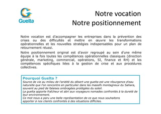 Guelta accompagne les entreprises dans la prévention des crises et dans le retournement opérationnel en regroupant des compétences diverses pour assurer leur pérennité face aux mutations. Le cabinet propose des interventions adaptées, allant de l'audit et du diagnostic à la mise en œuvre de plans d'actions en passant par la gestion de crise et la préparation à la cession. L'équipe, composée d'experts en direction générale, finance et gestion de crise, met son expérience au service des entreprises confrontées à des difficultés.