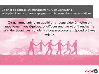 Akor Consulting est un cabinet de conseil en management spécialisé dans l'accompagnement des transformations humaines des entreprises. À travers quatre savoir-faire clés, il propose des solutions innovantes pour améliorer la performance collective, dynamiser les équipes et enrichir l'expérience client. L'approche repose sur des préconisations pragmatiques, des formations interactives, et une culture d'amélioration continue intégrant des valeurs d'enthousiasme, d'exigence et d'audace.