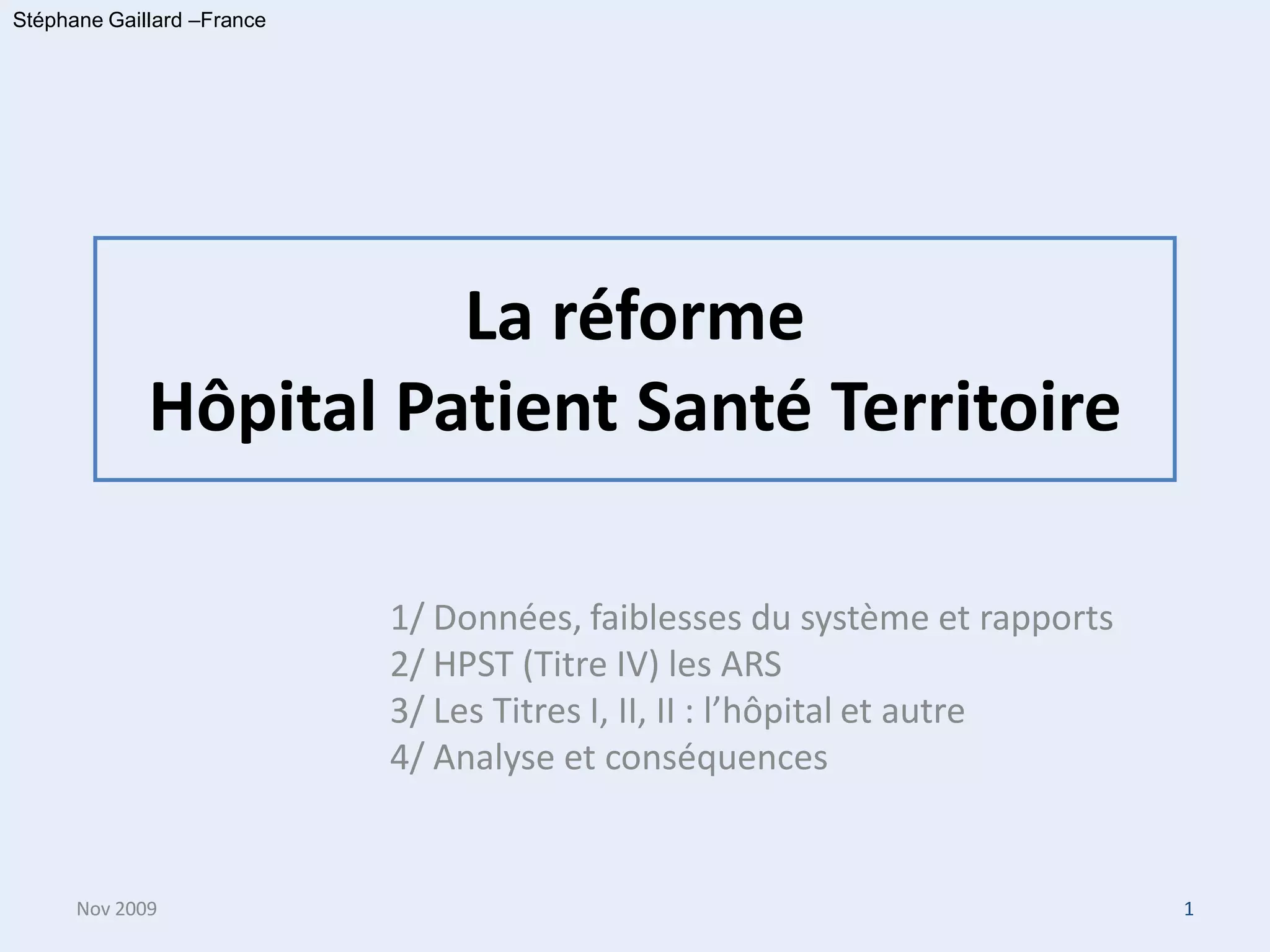Le document aborde les faiblesses du système de santé français, notamment la croissance des dépenses sans amélioration des indicateurs de santé et la cloisonnement des soins. Il décrit la création des Agences Régionales de Santé (ARS) comme une reforme indispensable pour un pilotage unifié et responsable du système de santé. Enfin, il mentionne les réformes de l'hôpital et les structures mises en place pour améliorer la continuité des soins et l'organisation entre le secteur public et privé.