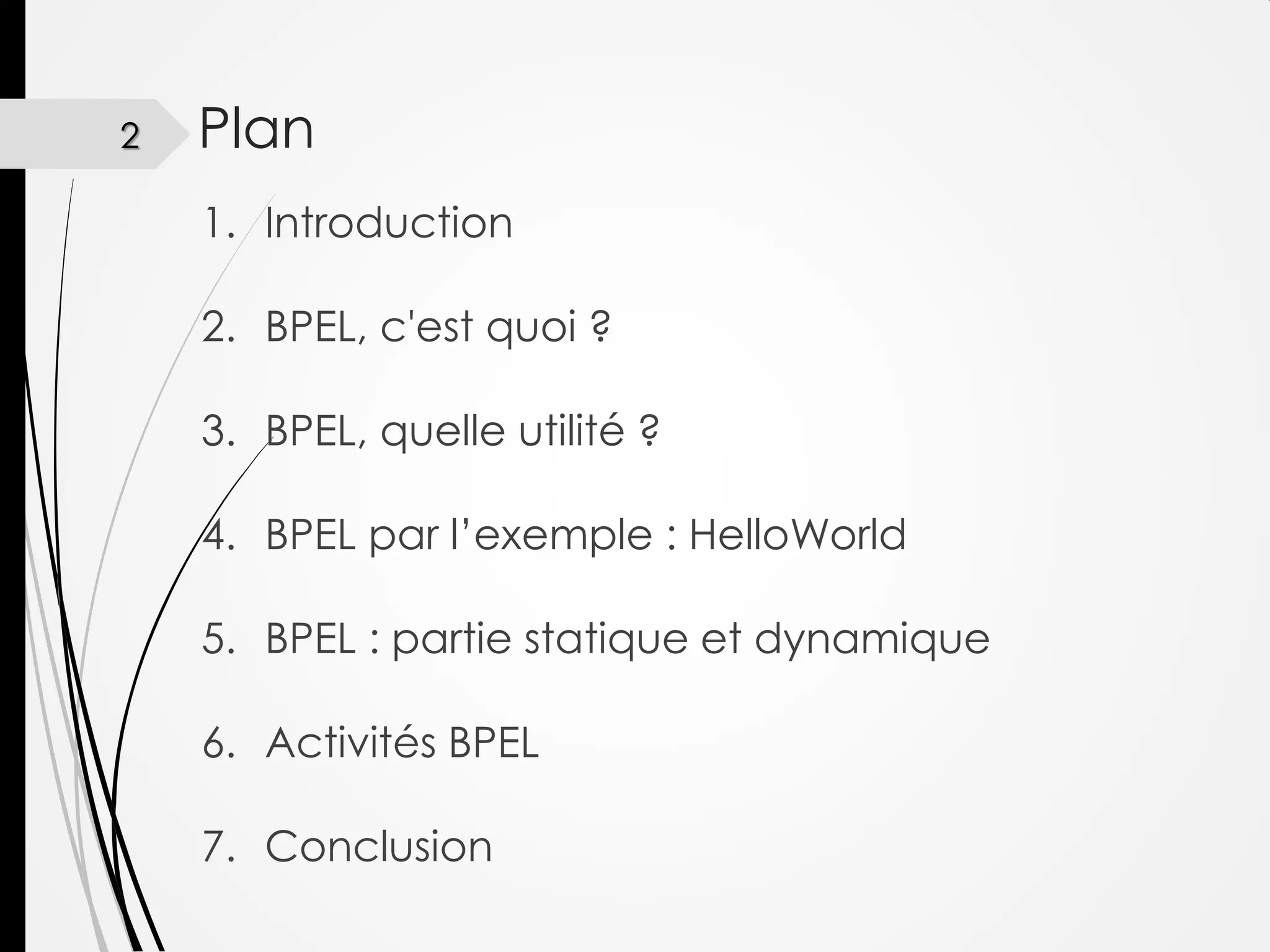 Le document présente le Business Process Execution Language (BPEL), un langage de programmation pour l'exécution de procédures d'entreprise complexes, accompagné d'exemples illustratifs. Il aborde les problématiques d'intégration de services web pour des scénarios tels que la réservation de billets d'avion, la recherche d'hôtels et la location de voitures. Le texte décrit également la structure et les activités clés de BPEL, notamment la gestion des erreurs et l'orchestration des services partenaires.