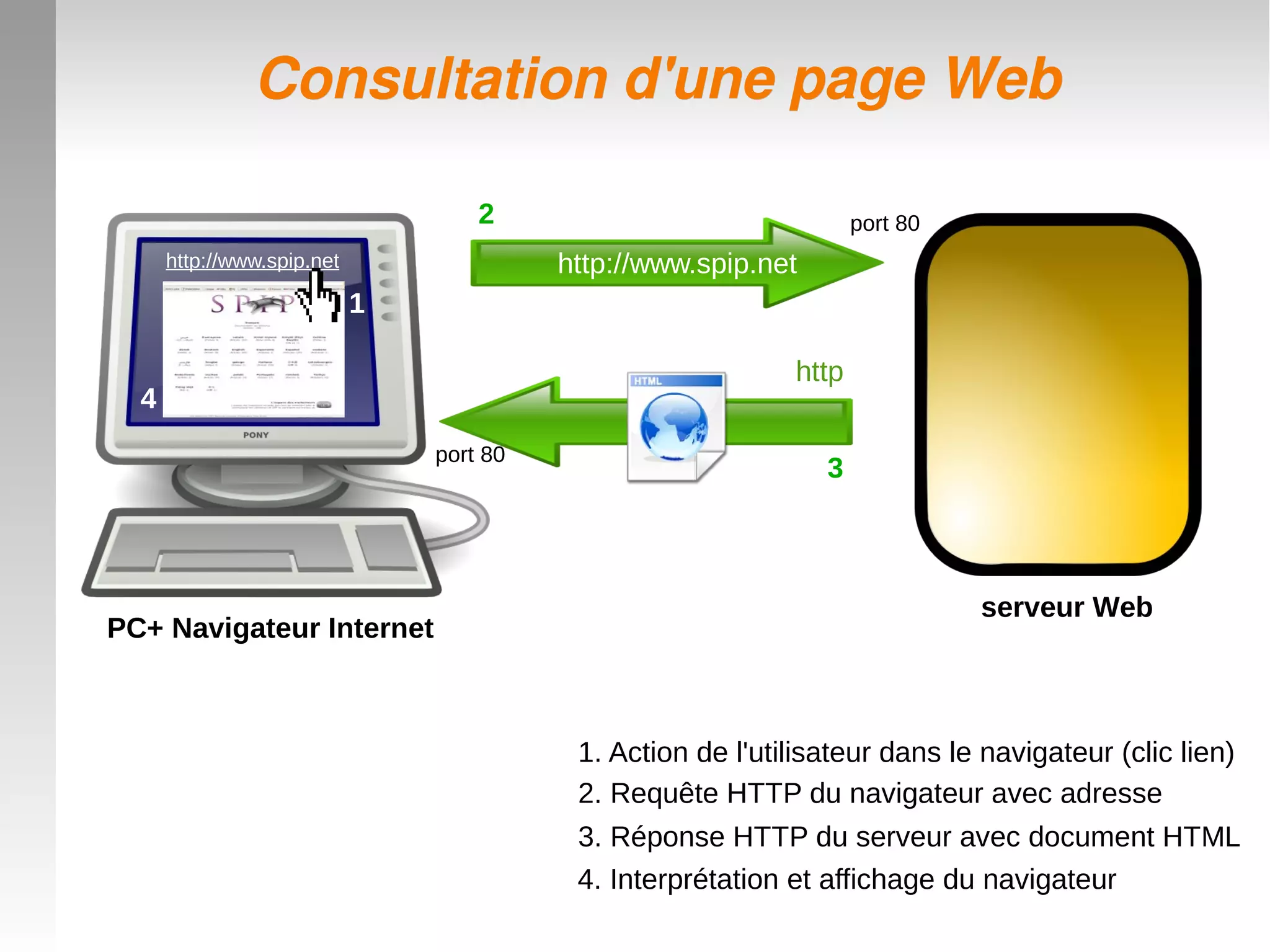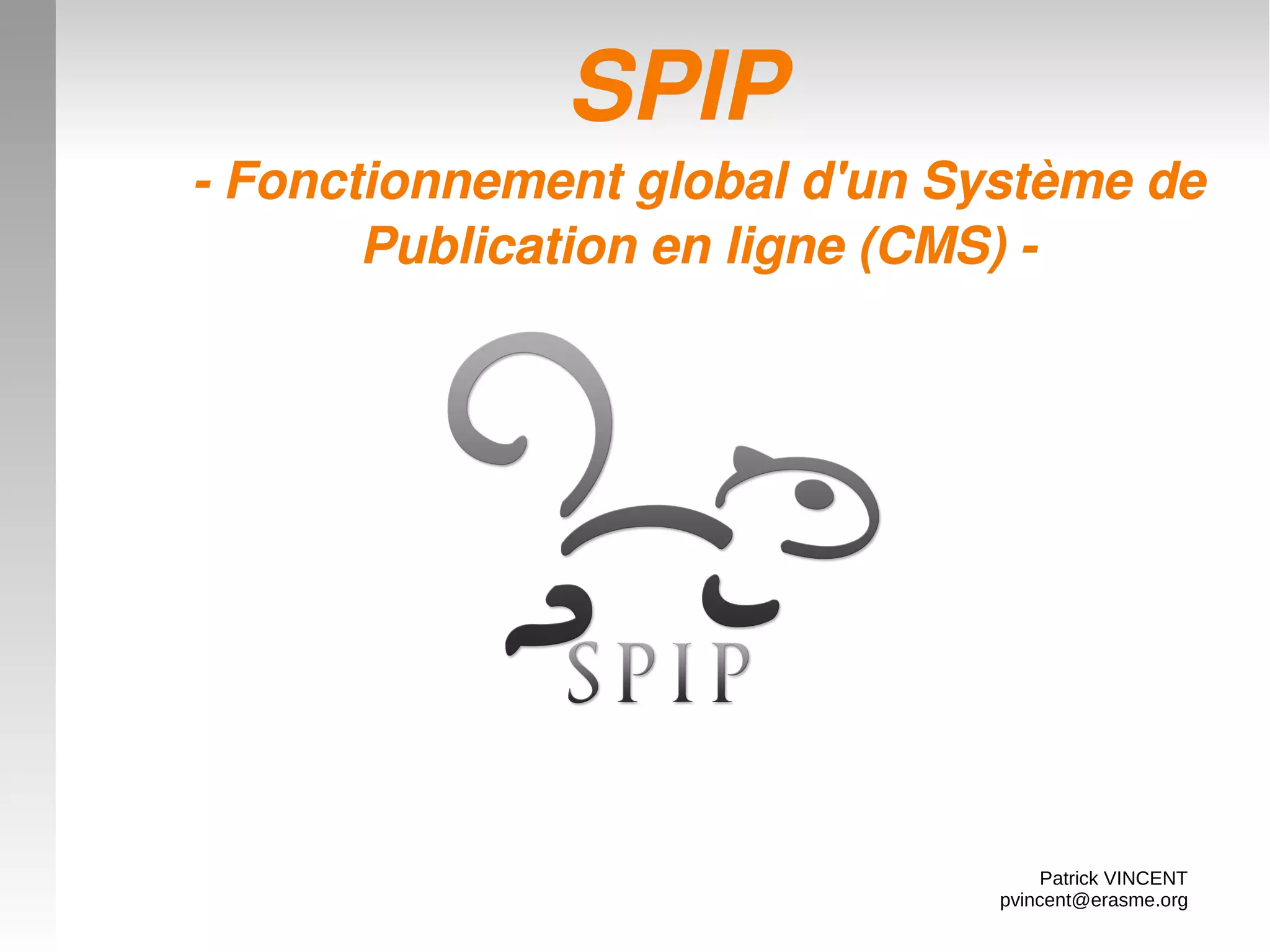 Le document décrit le fonctionnement d'un système de publication en ligne, spécifiquement le CMS SPIP, en expliquant les interactions entre le navigateur, le serveur web, et la base de données. Il détaille également les rôles des utilisateurs et la structure des données organisées sous forme de rubriques et articles. Enfin, il aborde l'intégration de ressources multimédias et la manière dont le contenu est séparé de sa mise en forme à l'aide de canevas et squelettes.