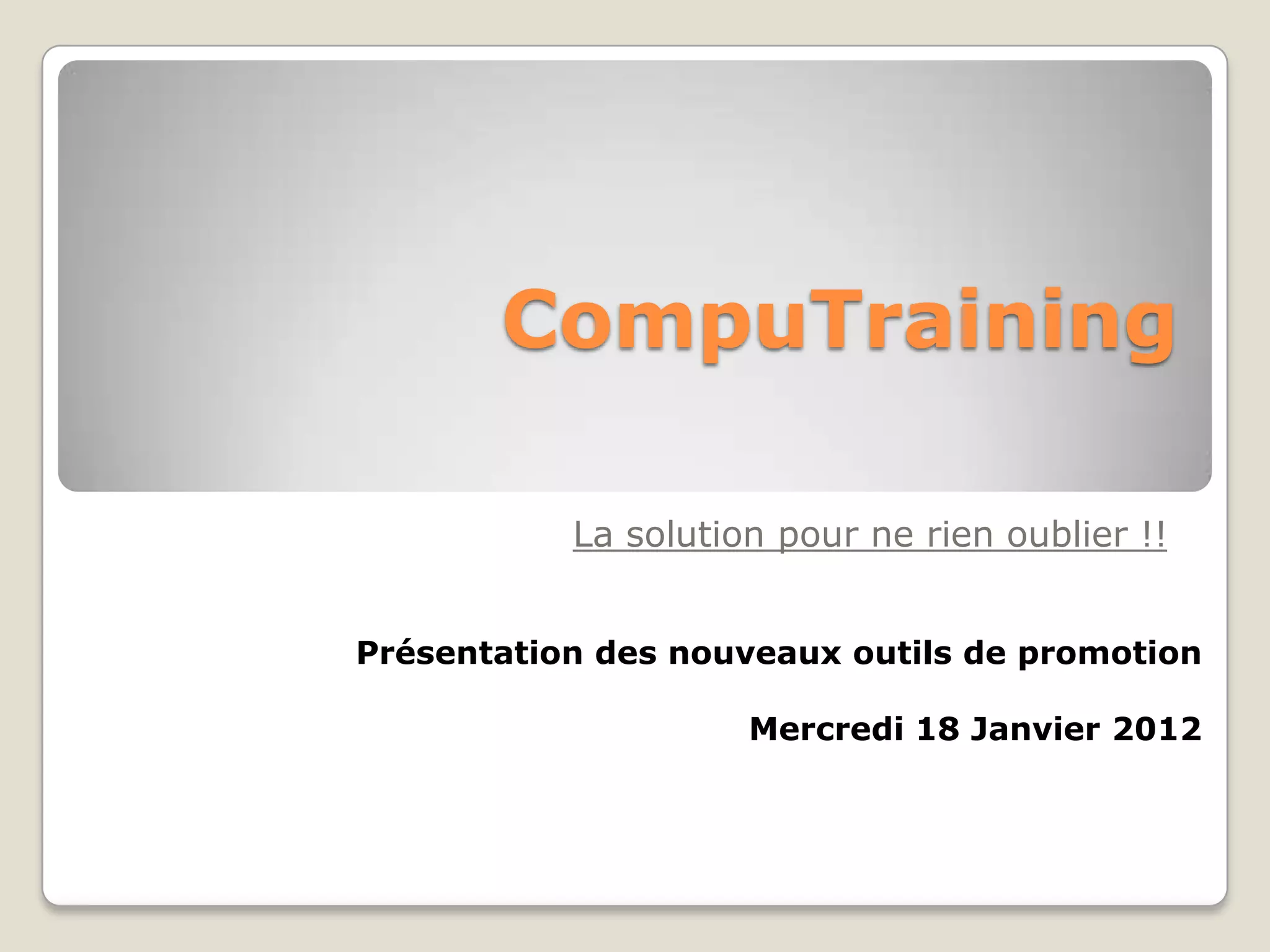 Computraining présente une solution à la baisse des ventes et à l'insatisfaction des clients due à des problèmes de mémorisation des cours, en proposant un nouvel outil de mémorisation via des vidéos sur internet. Ce système permettra aux élèves d'accéder aux formations malgré les oublis, et inclut une carte de visite avec flashcode pour un accès rapide. Les avantages de cette approche incluent la fidélisation de la clientèle et un accès constant au contenu de formation.