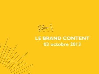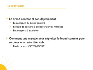 Le document traite du brand content, sa naissance, et son déploiement par les marques pour renforcer leur notoriété en ligne, en utilisant des contenus émotionnels et informatifs adaptés à leur public. Il présente une étude de cas sur Cote&Sport, qui a su exploiter le digital pour maintenir et accroître sa visibilité malgré l'interdiction de diffusion télévisée. La stratégie digital inclut du contenu interactif et des jeux pour engager les utilisateurs et augmenter leur implication avec la marque.