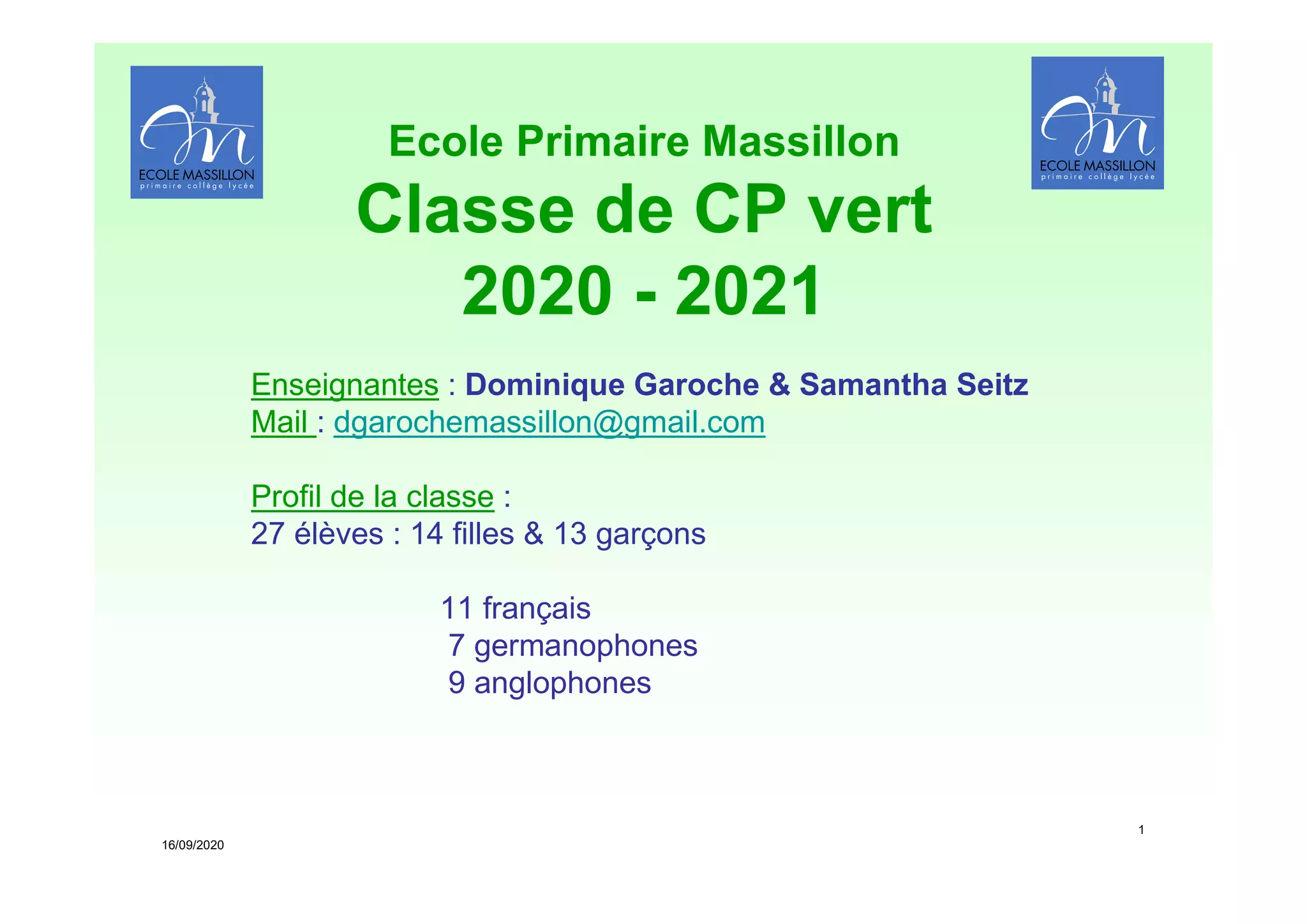 Le document présente les informations essentielles concernant la classe de CP vert de l'école primaire Massillon pour l'année scolaire 2020-2021, incluant un emploi du temps détaillé, les objectifs pédagogiques et les méthodes d'enseignement. Il met l'accent sur l'autonomie, la responsabilité et les compétences à acquérir en français et en mathématiques, ainsi que sur les evaluations et l'organisation des cours d'éveil chrétien et d'éducation morale et civique. Les enseignants communiquent également le fonctionnement des outils de classe et des attentes vis-à-vis des parents.