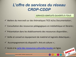 Le Centre Régional de Documentation Pédagogique (CRDP) de Toulouse offre divers services gratuits et abonnés aux acteurs du système éducatif, incluant des ateliers, des ressources pédagogiques, et des formations. Il dispose de pôles spécialisés en documentation, arts et culture, et TICE, contribuant à l'animation pédagogique et à l'équipement des établissements scolaires. Des événements comme le salon Didactica favorisent les échanges entre les acteurs de l'éducation et les ressources disponibles.