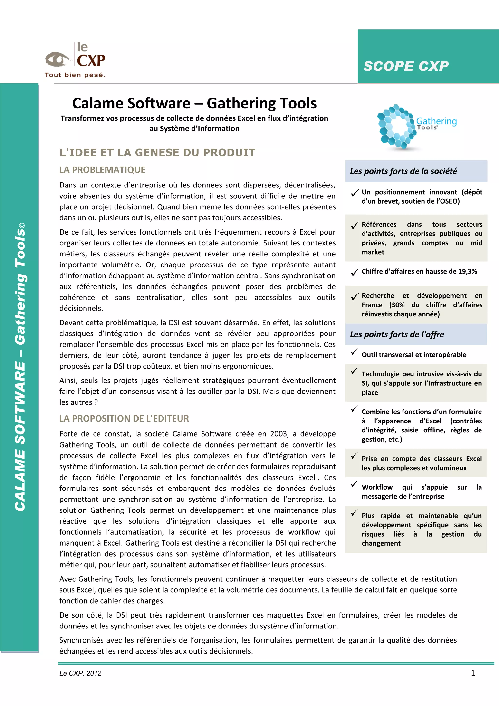 Calame Software a développé Gathering Tools, un outil innovant permettant d'intégrer des données collectées via Excel directement dans le système d'information d'une entreprise, en préservant l'ergonomie et la complexité de ces documents. Cette solution vise à améliorer l'automatisation, la sécurité et la traçabilité des processus de collecte de données, tout en offrant une interface familière aux utilisateurs fonctionnels. Gathering Tools s'adresse principalement aux grandes organisations publiques et privées, facilitant leur transition vers des processus moins dépendants des solutions Excel traditionnelles.