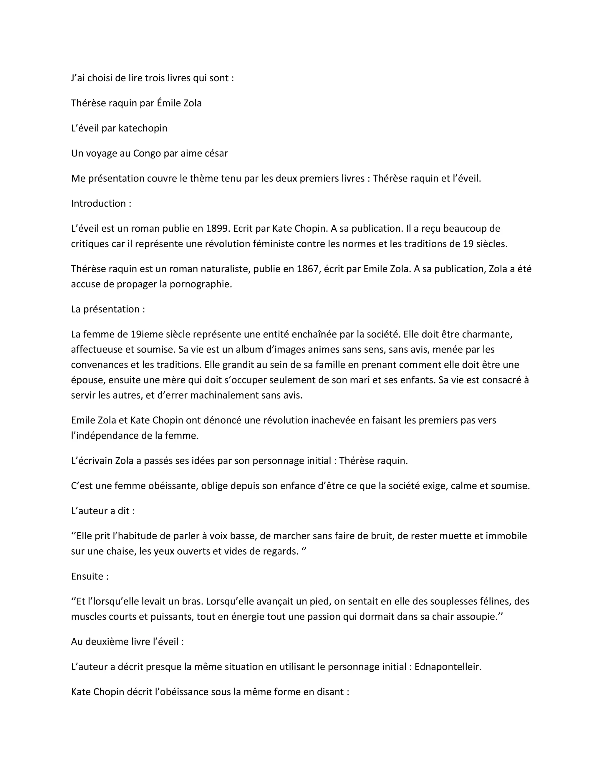 Le document compare les romans 'Thérèse Raquin' d'Émile Zola et 'L'Éveil' de Kate Chopin, tous deux abordant la condition de la femme au 19ème siècle. Il met en lumière la révolte de ces personnages féminins contre les normes sociétales et leurs quêtes d'indépendance, culminant dans un désespoir tragique. Les auteurs dénoncent la soumission féminine et appellent à une prise de conscience et à un changement social.