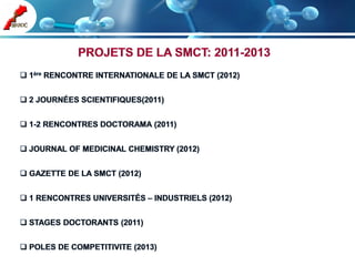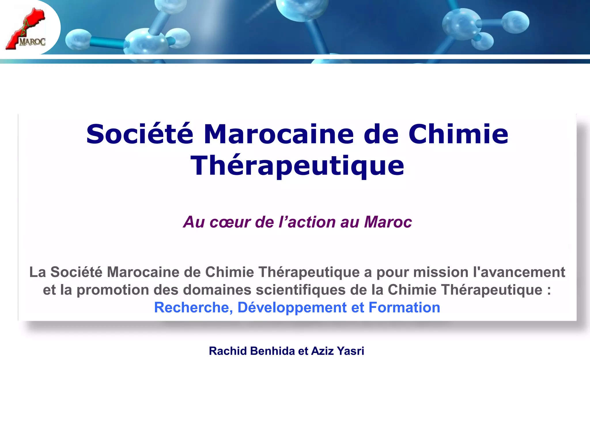 La Société Marocaine de Chimie Thérapeutique vise à promouvoir la recherche, le développement et la formation en chimie thérapeutique au Maroc. Fondée en 2009, elle s'efforce de fédérer chercheurs et institutions pour améliorer le niveau scientifique national et international. La société organise des manifestations scientifiques, édite des revues et crée des projets collaboratifs pour favoriser l'innovation et l'échange entre les membres.