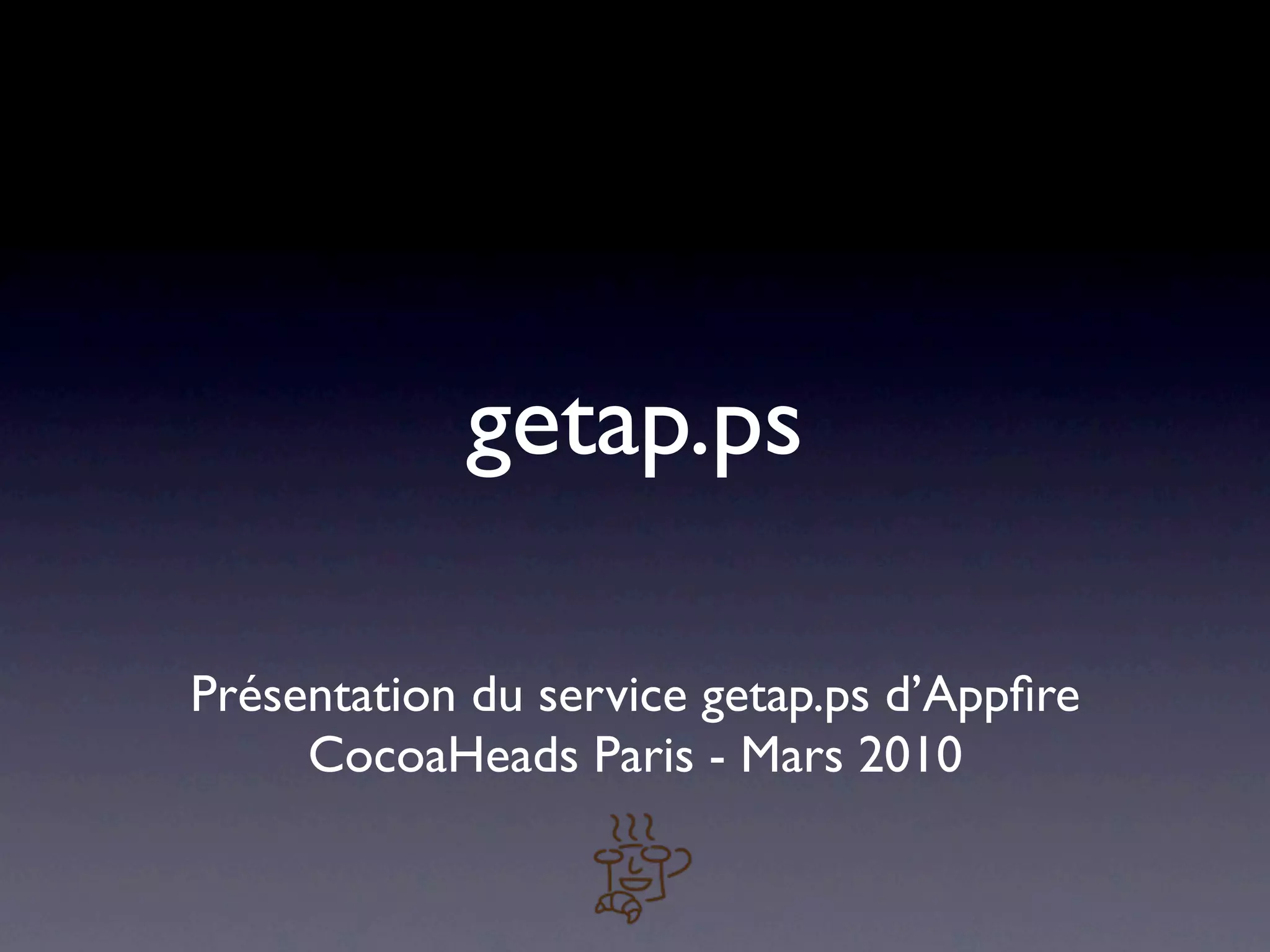 Le document présente le service getap.ps, un raccourcisseur d'URL qui offre également des statistiques et des options de conversion pour les ventes. Il permet de créer des liens courts sans préalablement s'inscrire, et fournit des statistiques détaillées par suffixe d'URL. Des exemples d'utilisation et des contacts sont également mentionnés.
