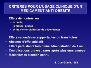 Ce document traite des traitements pharmacologiques pour l'obésité, en mettant en avant les critères cliniques pour l'utilisation d'antidépresseurs et d'autres médicaments. Il discute de l'efficacité, des effets secondaires, et des stratégies de modifications du mode de vie nécessaires pour soutenir la perte de poids et la gestion des co-morbidités. De plus, il aborde les perspectives futures dans le traitement de l'obésité, notamment l'utilisation de médicaments comme le pramlintide.