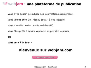 Webjam est une plateforme de publication communautaire permettant aux utilisateurs de créer des sites personnalisables et collaboratifs. Les lecteurs peuvent contribuer et interagir, tout en ayant un contrôle sur le contenu et les participants. Des exemples d'utilisation incluent des communautés variées, allant de la musique à la politique.