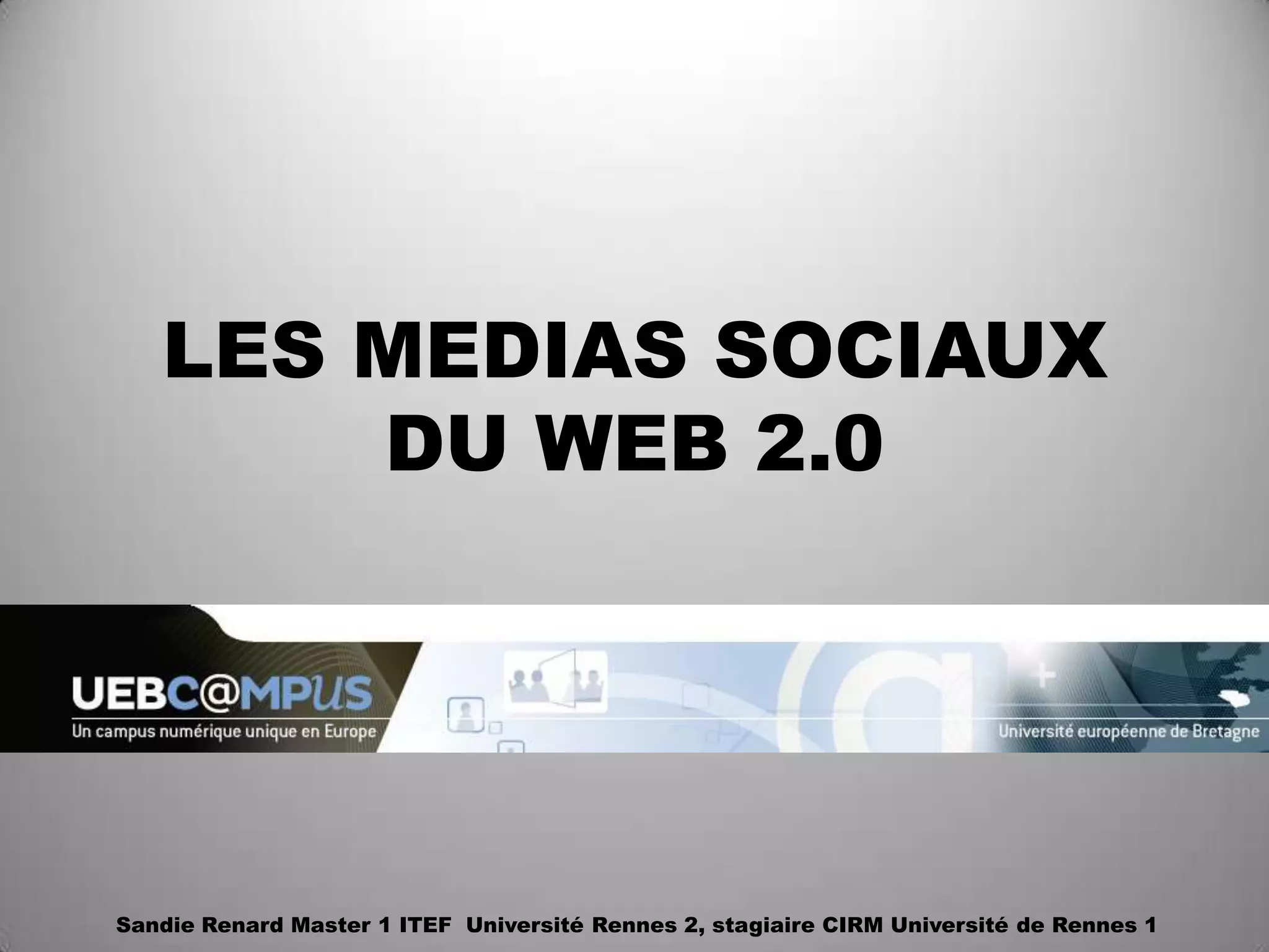 Ce document présente une classification des médias sociaux du Web 2.0 selon sept objectifs, incluant des outils de réseautage, de partage de contenus, de clavardage et de collaboration. Il détaille également des exemples spécifiques de plateformes comme Viadeo, Google+, Edmodo et LinkedIn, en discutant de leurs fonctionnalités, avantages et inconvénients dans le cadre pédagogique. L'importance d'une bonne gestion de l'identité numérique et les résultats d'expérimentations auprès d'étudiants sont également abordés.