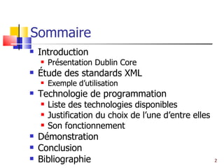 Le document présente un projet sur le Dublin Core, un schéma de métadonnées pour décrire des ressources numériques. Il traite des technologies XML et présente un choix technologique en faveur de PHP pour sa facilité d'utilisation et son efficacité. Le projet aborde également des exemples pratiques d'utilisation du XML et des transformations via XSLT.