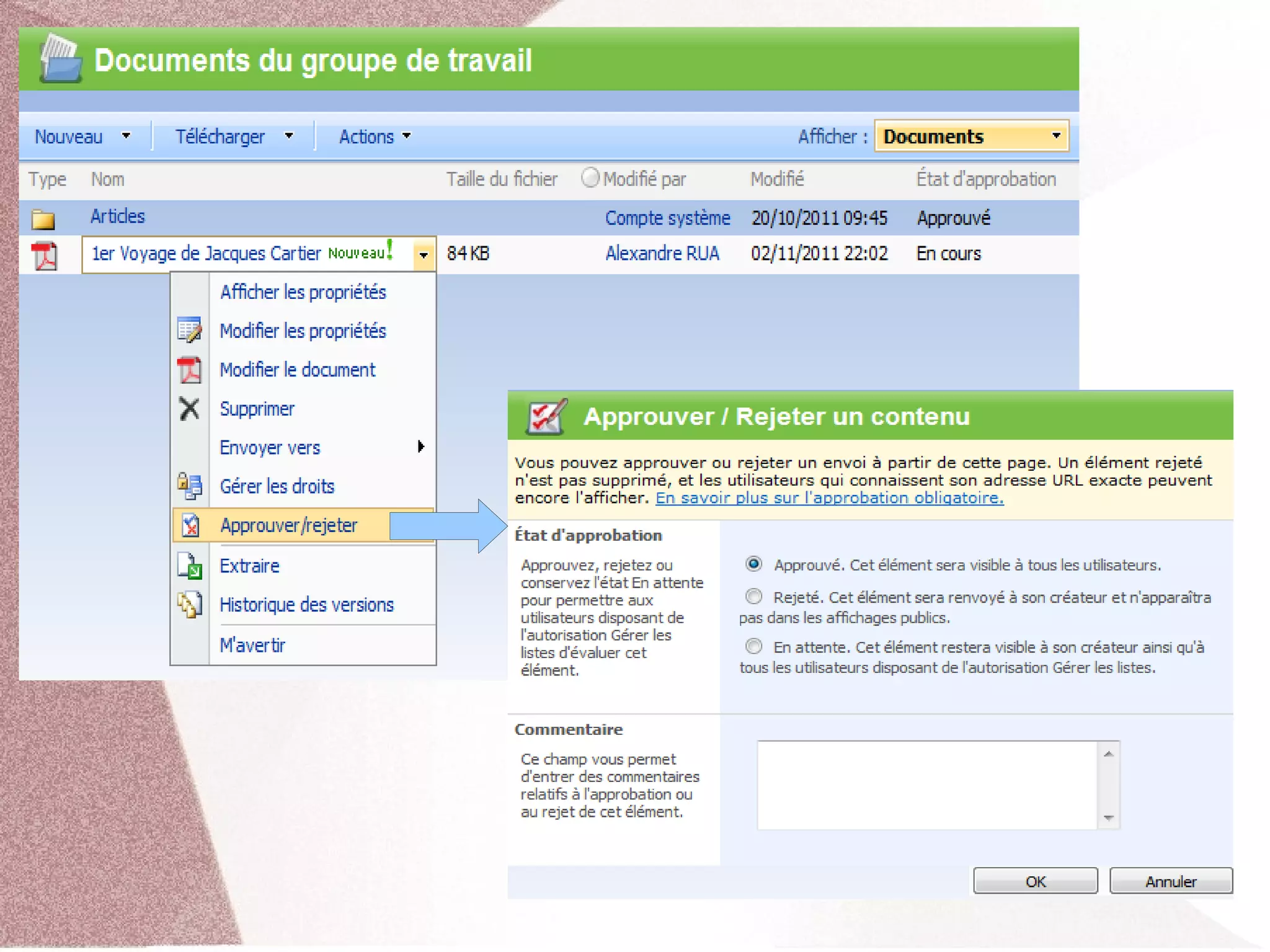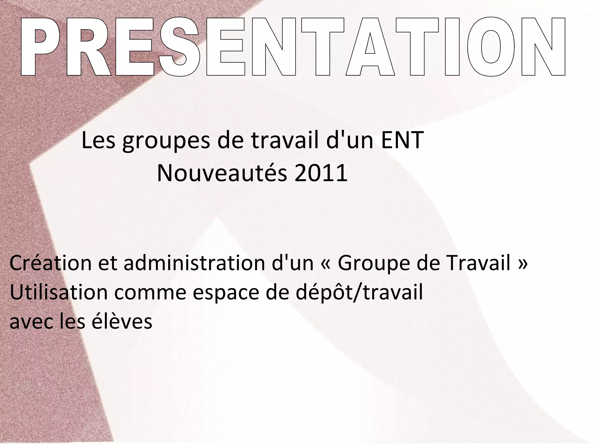 Le document décrit la création et la gestion de groupes de travail dans un environnement numérique éducatif, permettant aux enseignants d'ajouter des membres et de gérer leurs droits d'accès. Il explique comment les documents soumis par les élèves sont soumis à validation avant de devenir visibles pour le groupe. De plus, il aborde la possibilité de configurer des droits spécifiques sur des documents ou dossiers au sein du groupe de travail.