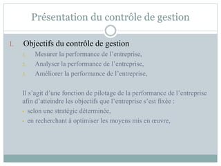 Le contrôle de gestion est une fonction qui vise à mesurer, analyser et améliorer la performance de l'entreprise à travers des outils comme la gestion budgétaire et les tableaux de bord, en s'adaptant aux spécificités de chaque organisation. Il nécessite une comptabilité générale à jour et implique l'élaboration de budgets selon la structure de l'entreprise. Cependant, les méthodes d'analyse des coûts peuvent être complexes et présentent certaines limites, notamment en matière de précision des résultats.