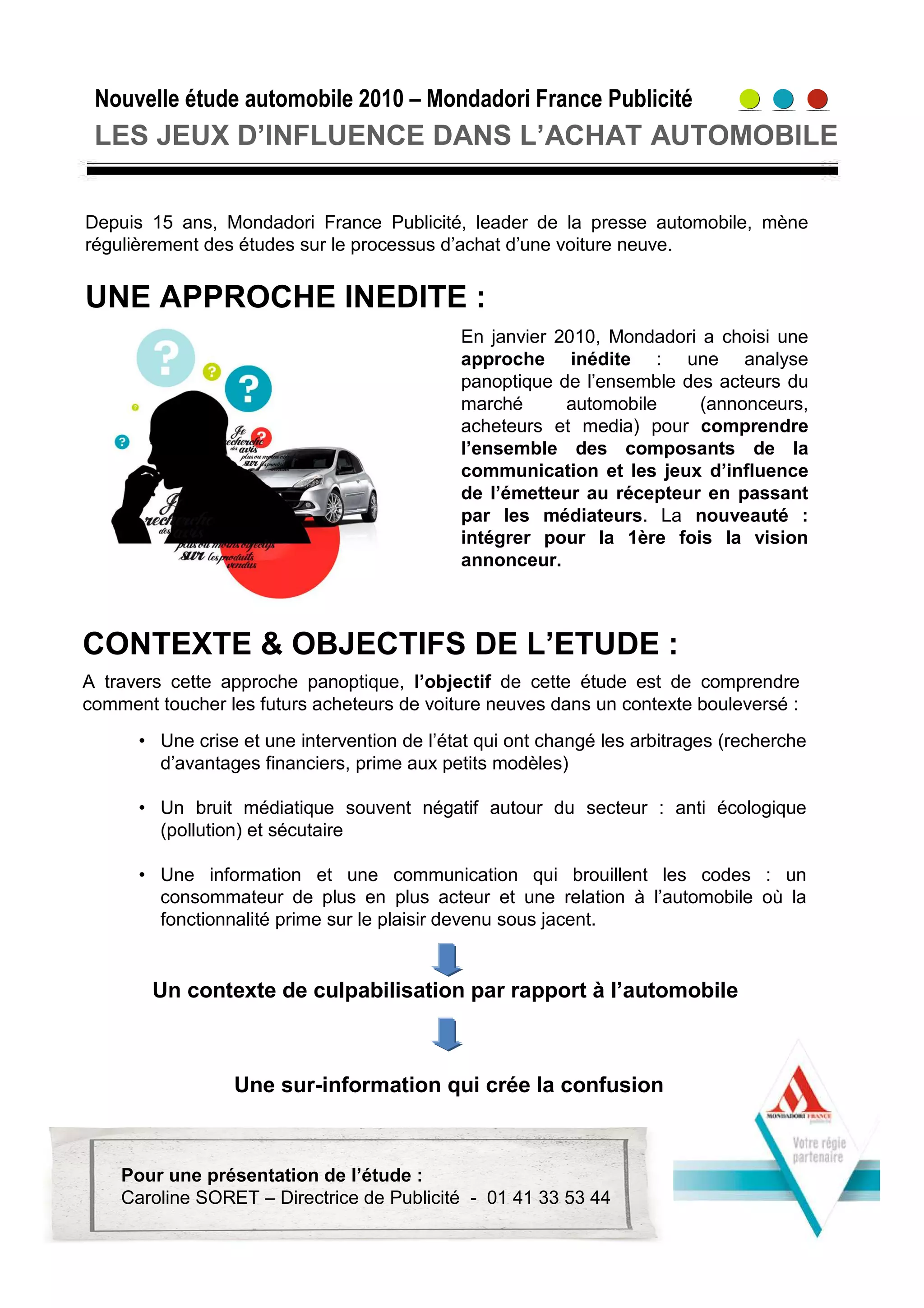 La nouvelle étude automobile de 2010 par Mondadori France Publicité analyse le processus d'achat d'une voiture neuve en tenant compte des influences médiatiques et des perceptions des différents acteurs. L'étude vise à comprendre comment toucher les futurs acheteurs dans un contexte de crise et de messages contradictoires autour de l'automobile. Elle adopte une méthodologie innovante en trois volets pour explorer les opinions des futurs acheteurs, des constructeurs et des médias.