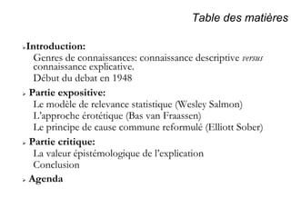 Le document discute de la causalité et de la probabilité à travers divers modèles statistiques, notamment les approches de Salmon et de Van Fraassen, explorant les différences entre la connaissance descriptive et explicative. Il aborde aussi les principes de la cause commune et les valeurs épistémologiques des modèles d'explication en science. En conclusion, il souligne l'importance de la pertinence causale et contextuelle pour identifier les facteurs causaux appropriés dans l'analyse scientifique.