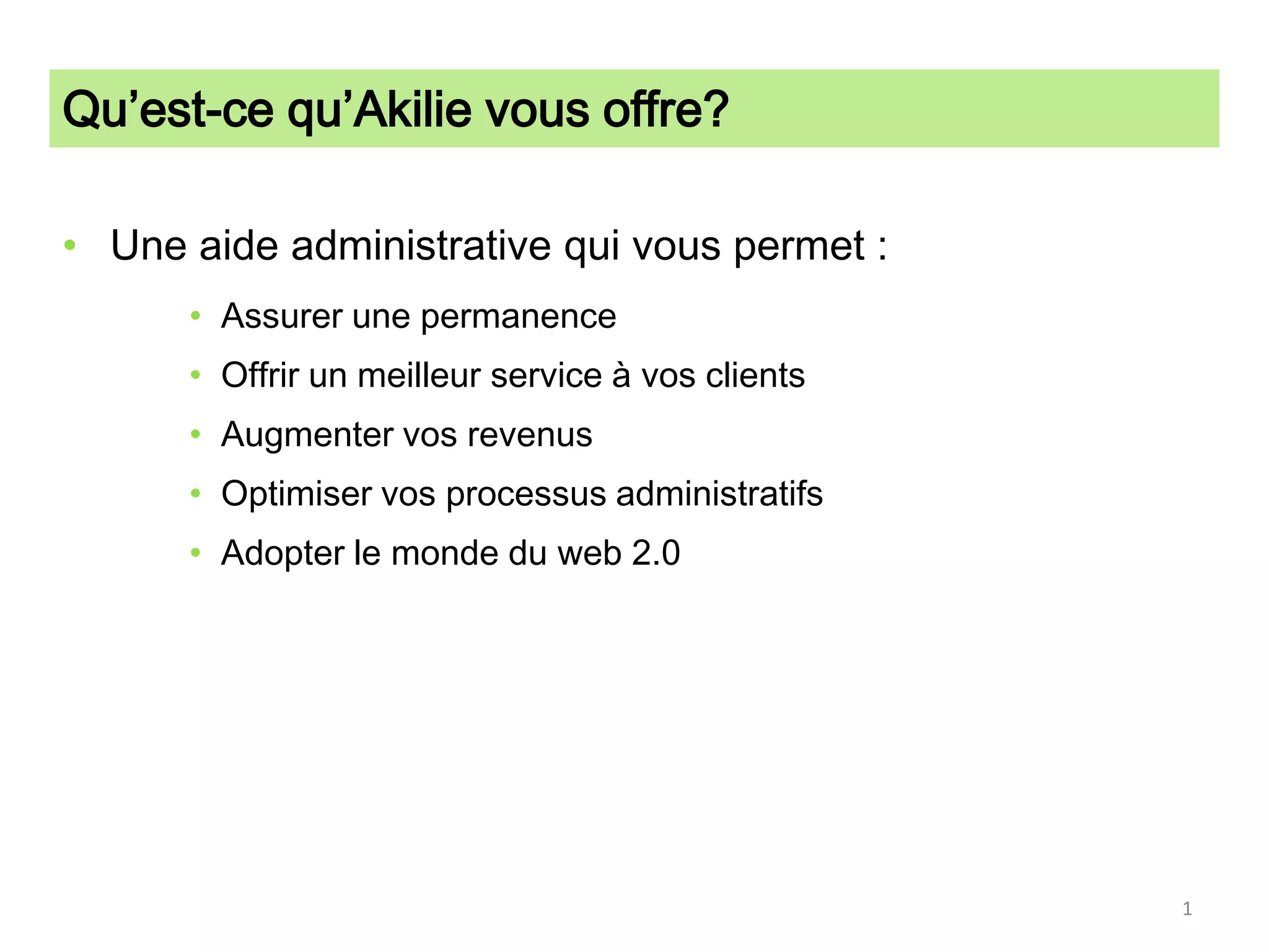 Akilie offre une solution administrative permettant d'optimiser les services aux clients et d'automatiser la gestion des interactions. Ses fonctionnalités incluent la gestion des paiements par carte de crédit, l'inscription en ligne, et une amélioration de la productivité. La tarification est basée sur un abonnement mensuel sans engagement à long terme, avec des bénéfices tels qu'une réduction des coûts et une augmentation des revenus.