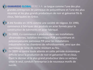 Kamaridis Global Wire S.A., fondée en 1976 en Grèce, est un leader dans la fabrication de panneaux de polyuréthane, de fils et de clous galvanisés. L'entreprise a su se diversifier tout en atteignant une reconnaissance internationale, exportant 60 % de sa production dans 40 pays. Grâce à des produits de qualité et des prix compétitifs, Kamaridis se classe parmi les plus grandes entreprises du secteur en Grèce.