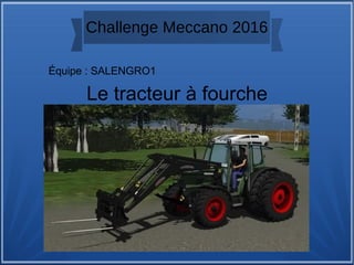 L'équipe Salengro1 a construit un tracteur à fourche en utilisant des plans Meccano, en intégrant un châssis, un moteur et un support pour la fourche. Ils ont étudié le fonctionnement d'un vérin et conçu un système avec une seringue pour simuler le mouvement de la fourche. Le document mentionne également des métiers liés à la fabrication et à l'assemblage de pièces industrielles.