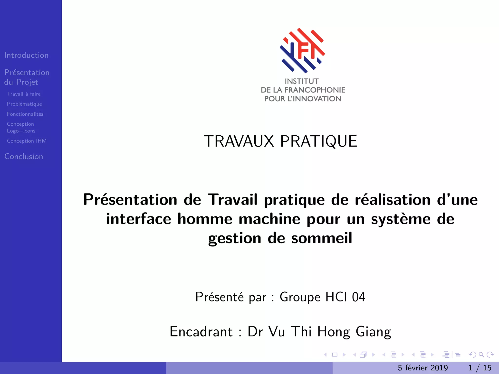 Le projet porte sur la conception d'une interface pour un système de gestion de sommeil, incluant diverses fonctionnalités telles que la durée de sommeil, la position de sommeil et les statistiques. Les principales problématiques abordées sont le respect des normes ISO et le choix des outils et technologies adéquats. L'application, nommée 'Good Sleep', utilise des technologies comme HTML, JavaScript et CSS pour son développement.