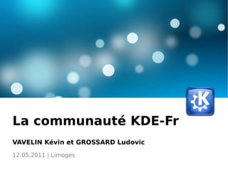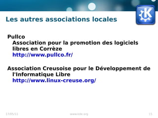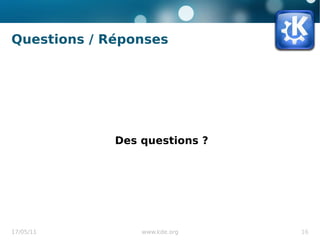 Le document présente la communauté KDE, son histoire depuis sa création en 1996, ainsi que les différentes versions du logiciel. Il mentionne également des distributions Linux utilisant KDE par défaut et fournit des ressources pour la traduction et le développement d'applications. Enfin, il aborde l'association Alternatives87 et d'autres initiatives locales pour la promotion des logiciels libres dans la région de Limoges.