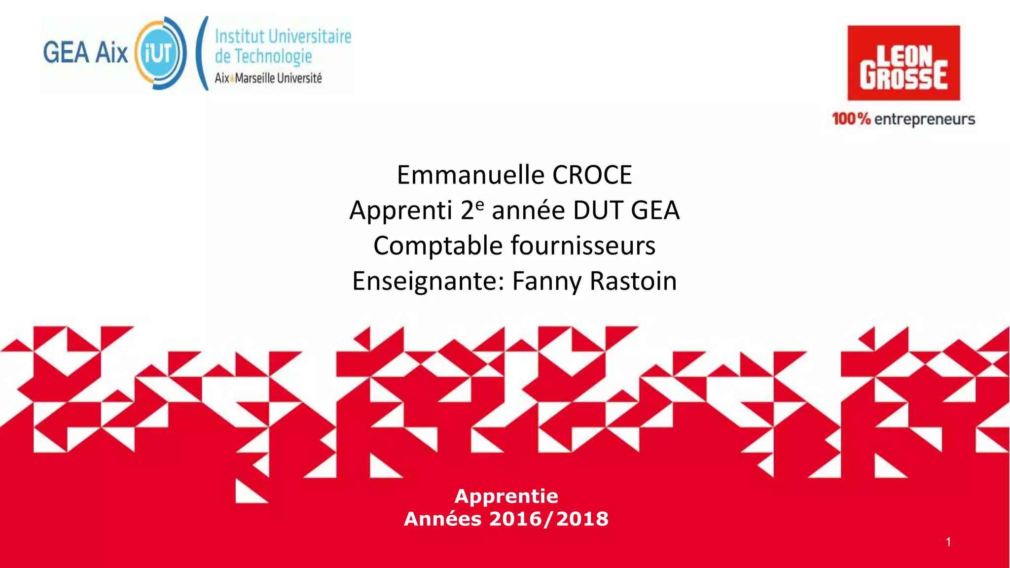 Le document présente le parcours d'Emmanuelle Croce, apprentie en DUT GEA au sein de l'entreprise familiale Léon Grosse entre 2016 et 2018. Il décrit l'organigramme, les activités générales, les missions de fin d'année ainsi qu'un bilan professionnel et personnel. Léon Grosse est une entreprise de BTP avec un chiffre d'affaires de 636 millions d'euros et plus de 2000 salariés.