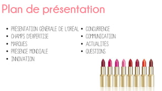 Le document présente un aperçu complet de L'Oréal, première entreprise cosmétique mondiale, avec des informations sur ses marques, son innovation, et sa présence mondiale dans plus de 130 pays. Il aborde également les stratégies de marketing, l'adaptation des produits aux besoins culturels variés et les défis de la concurrence dans le secteur. Enfin, des questions sont posées sur l'impact de l'héritage familial et la stratégie de présence sur le marché émergent et dans le secteur du luxe.