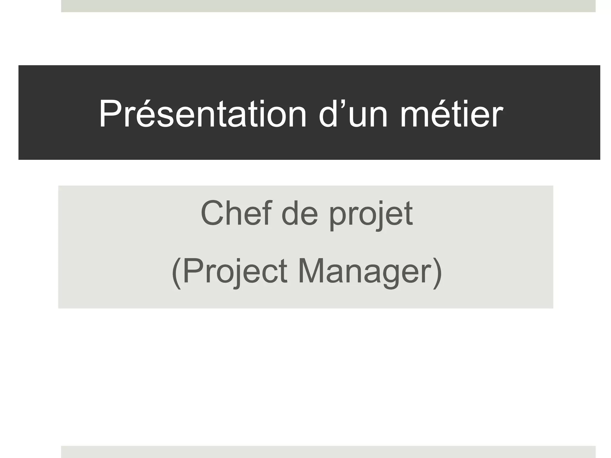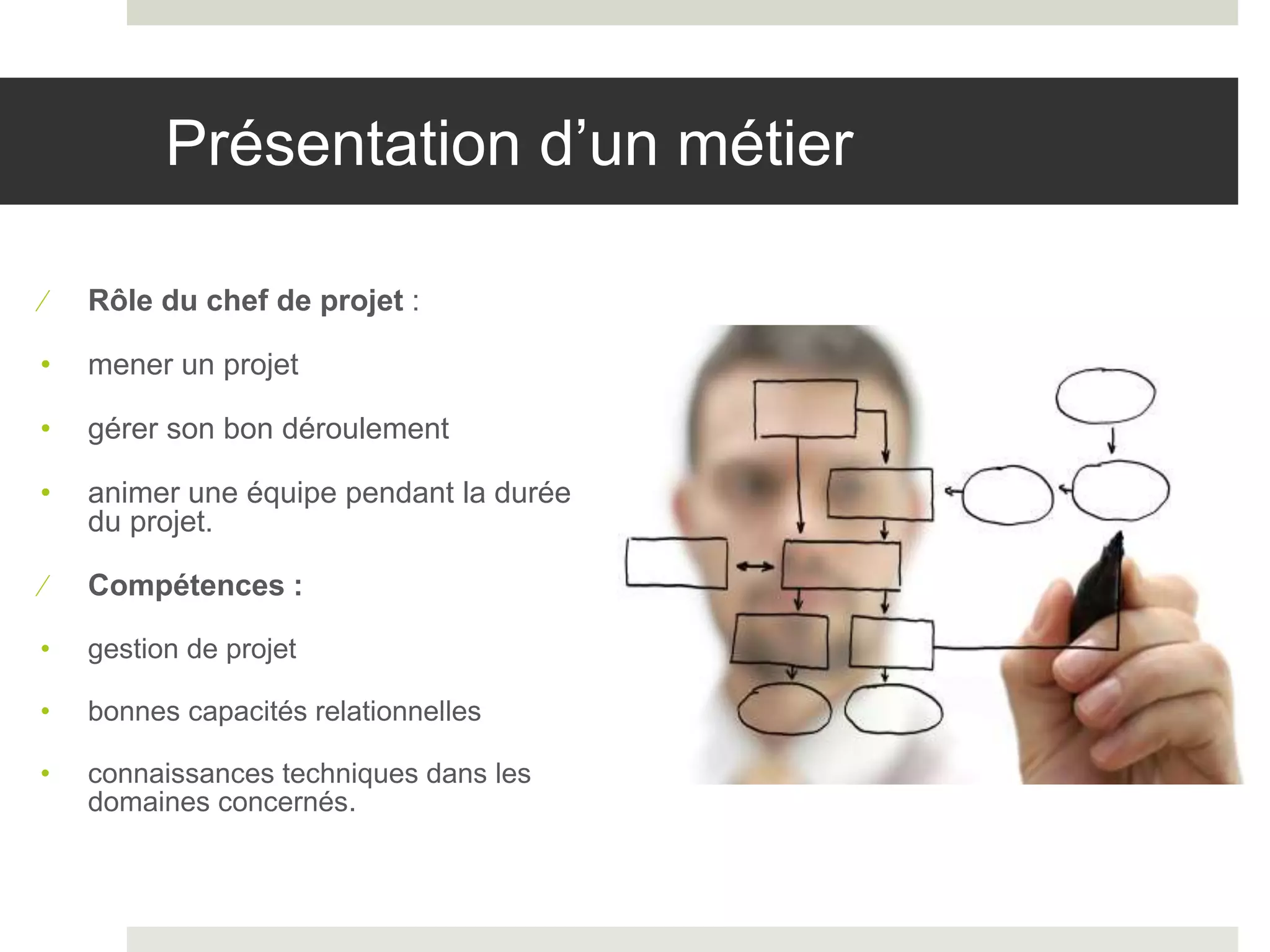 Le chef de projet est responsable de la conduite et du bon déroulement d'un projet tout en animant une équipe. Il doit posséder des compétences en gestion de projet, en relations interpersonnelles et en techniques spécifiques au domaine. Ses principales tâches incluent la gestion des risques, la sélection des fournisseurs, l'assurance qualité, et la communication avec les parties prenantes.