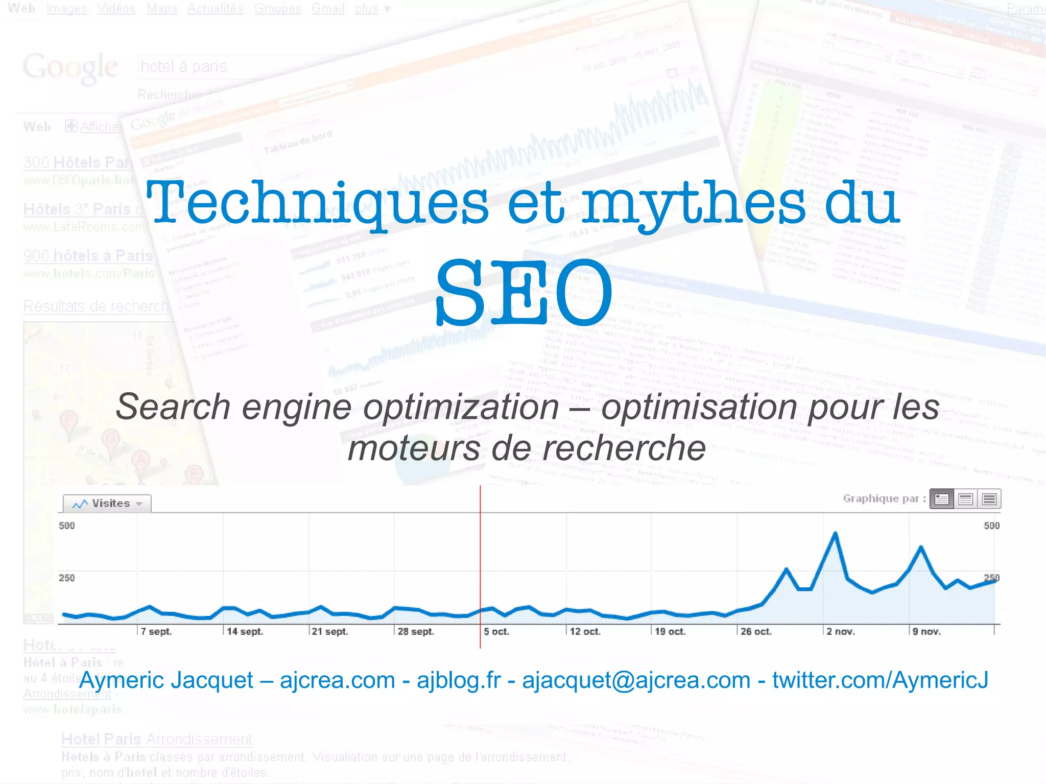 Le document traite des techniques et des mythes du référencement SEO, en expliquant les différences entre les approches 'white hat' et 'black hat'. Il met en évidence diverses idées reçues sur l'importance du référencement, le rôle du contenu et des liens, ainsi que la perception des moteurs de recherche, en particulier Google. Enfin, il souligne que le référencement nécessite des efforts continus, des tests et une bonne compréhension des mécanismes des moteurs de recherche.
