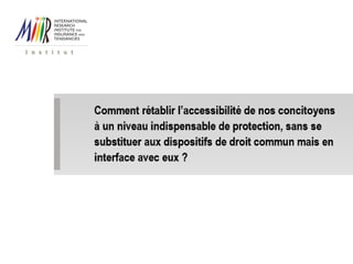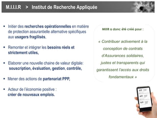 L'institut de recherche m.i.i.i.r se consacre à l'élaboration de solutions d'assurance alternatives pour des usagers fragilisés, en visant à rendre les contrats d'assurances solidaires plus accessibles et adaptés aux besoins réels. Le projet inclut la collaboration avec des centres communaux d'action sociale (CCAS) pour identifier et accompagner les bénéficiaires. Avec plus de 11 millions de foyers fiscaux concernés, l'initiative cherche à redresser l'accessibilité des niveaux de protection assurantielle face à des défis croissants tels que la précarité financière.